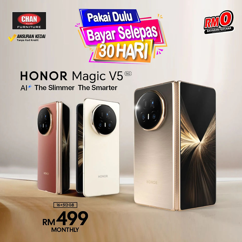 Jangan lepaskan peluang keemasan ini untuk menjadi antara pemilik terawal HONOR Magic V5. Stok adalah terhad! Segera kunjungi cawangan Chan Furniture yang berdekatan dengan anda untuk merasai sendiri kehebatan telefon pintar lipat masa kini.